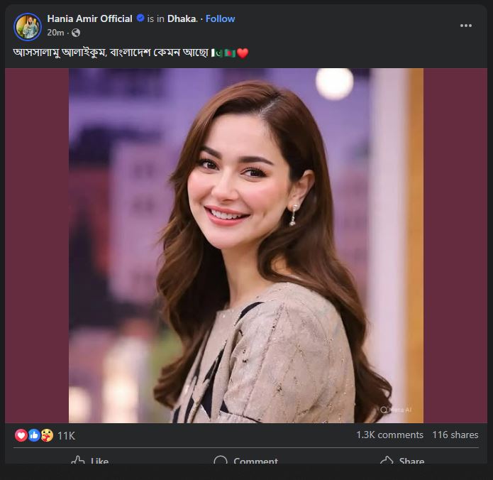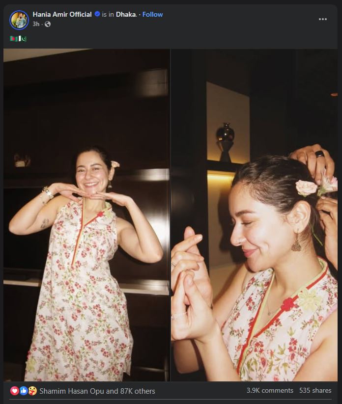 সামাজিক যোগাযোগমাধ্যমে হানিয়া তার দুটি ছবি শেয়ার করেন। এরপর লোকেশন দেন ঢাকা। তারপর বাংলাদেশ ও পাকিস্তানের পতাকার ইমোজি দেন তিনি। তার আগে সানসিল্ক বাংলাদেশের পেজ থেকে হানিয়ার একটি ভিডিও শেয়ার করা হয়।